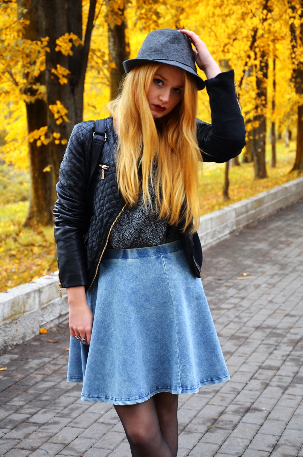 kapelusz - sh (h&m) / sweter - sh (f&f) / spódnica - sh / kurtka - obsession / plecak - cropp / biżuteria - katherine / buty - brand Krosno